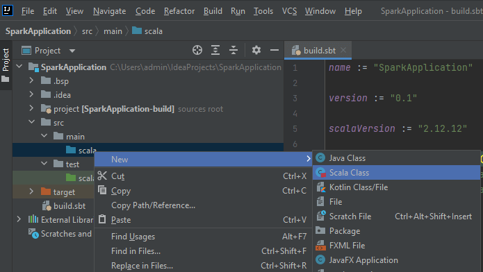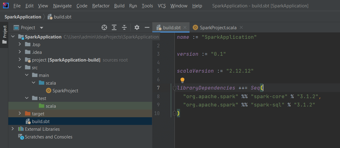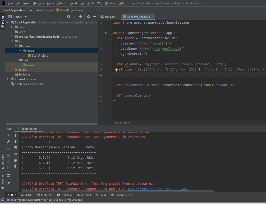 Otwórz plik build.sbt i dodaj biblioteki Sparka. Pamiętaj, że bardzo ważne są wersje wszystkich bibliotek jakie dodasz. Najczęstsze błędy to niekompatybilne wersje języka i/lub wersji bibliotek.