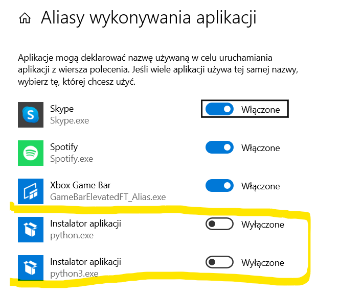 1. Wyłącz „Manage App Execution Aliases” (Alliasy wykonania aplikacji) dla Pythona