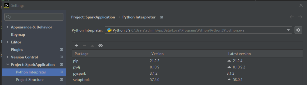 1. Po odpaleniu PyCharm trzeba doinstalować dwie paczki py4j i pyspark. Moża to zrobić z File > Settings > Project: <Project Name> – Kliknij znak plus nad tabelką. Wpisujesz py4j a potem pyspark (masz opcję wyboru wersji, upewnij się że pasuje do wersji Spark, którą pobrałeś)