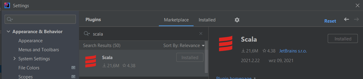 Po zainstalowaniu najważniejsze elementy, które trzeba doinstalować to plugin Scala. Żeby zainstalować plugin: