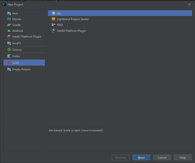 1. Stwórz nowy projekt. Z okna startowego Intellij lub z Menu File > New > Project. Wybierz Scala > sbt