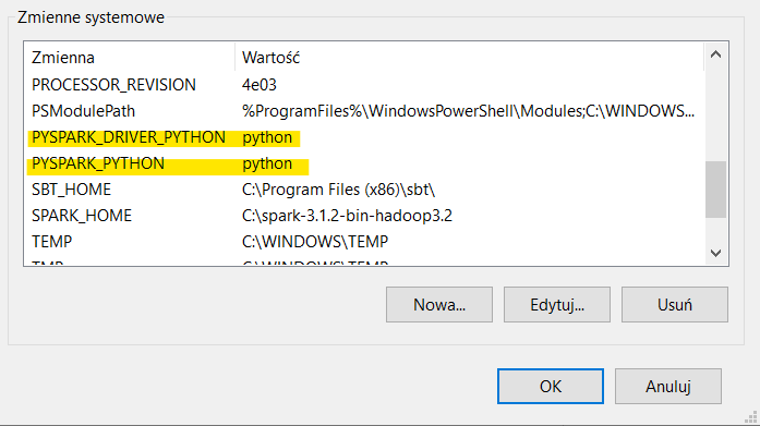 1. Dodaj wartości dla zmiennych PYSPARK_DRIVER_PYTHON i PYSPARK_PYTHON