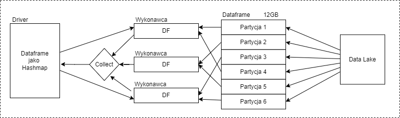 W drugim scenariuszu jeżeli robisz broadcast, czyli przesyłasz dataset na cały klaster to musisz zwrócić uwagę na ilość dostępnej pamięci. Przy przesyłaniu danych dochodzi do ich powielenia na sterowniku i w wykonawcach, zanim wkroczy GC (garbage collector) to pamięć będzie zajęta. Poniższy diagram przedstawia wymianę danych – jeśli na wejściu df ma 12GB to zanim wkroczy GC i zrobi porządek danych będzie 48GB (driver + wykonawcy = 12*4).