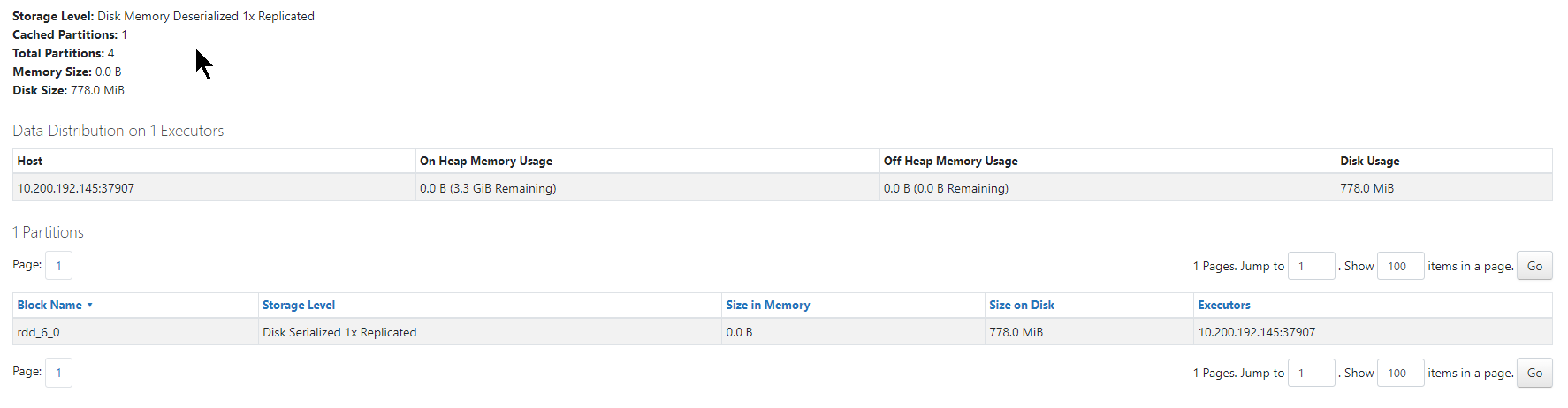 - Na dysku: Za duże partycje RDD mogą zostać zapisane na dysku. Jest to wada z punktu widzenia osiągów, ciągły zapis i odczyt są wolne. Plusem jest większa odporność na awarie bo dane są na dysku.