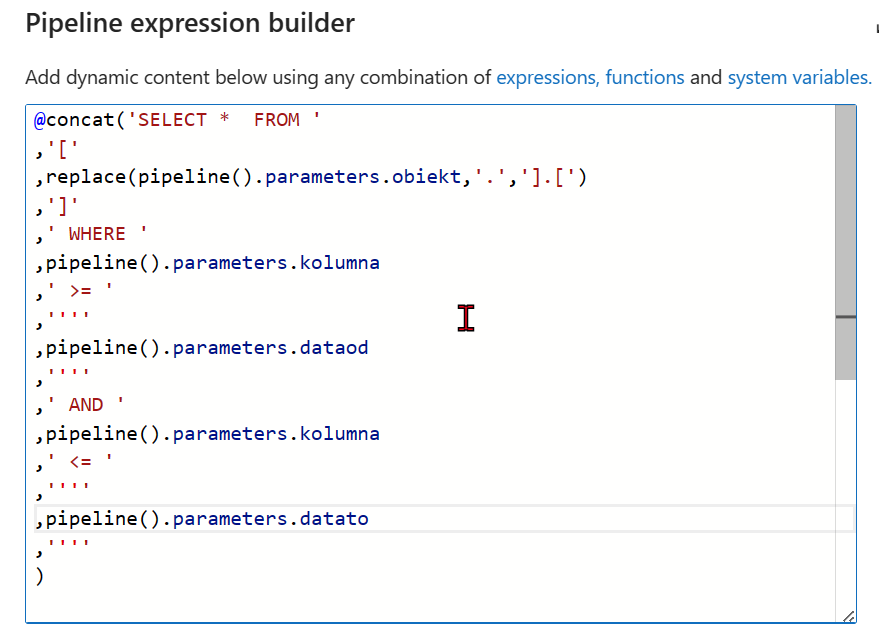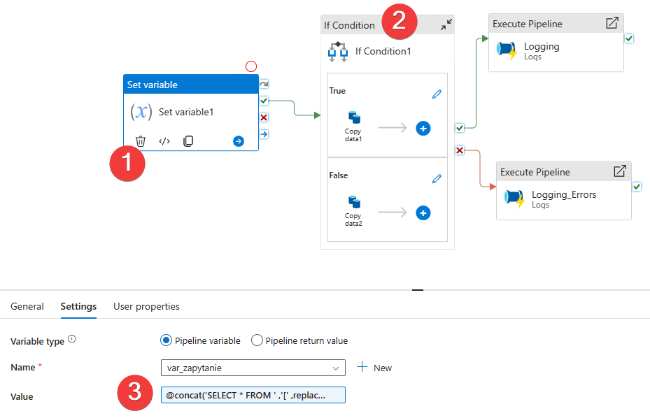- Akcja Set Variable na podstawie otrzymanych konfiguracji dynamicznie stworzy zapytanie SQL. Dane do kwerendy pochodzą z poprzedniego kroku (pipelina). Najważniejsze jest to, że dla każdej tabeli zapytanie SQL jest tworzone dynamicznie. np. możesz zdefiniować osobną kolumnę dla każdej tabeli, która pobierze dane całościowo lub inkrementalnie na podstawie innej konfiguracji. W tym wzorcu każda tabela, do pobrania ma osobną konfigurację.