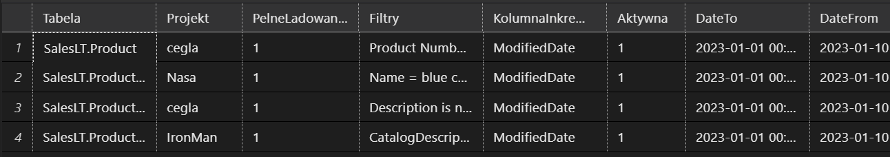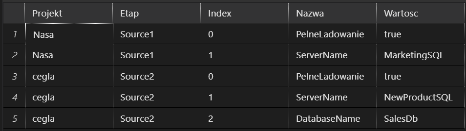 Najważniejsze będą dwie tabele jedna z listą konfiguracji potrzebnych dla potrzeb pipelina, poniżej przykład takiej tabeli