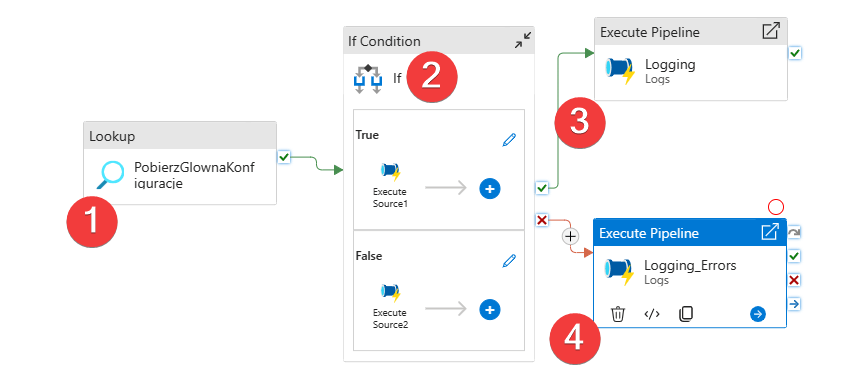 Source1 to jest pierwszy pipeline kontrolujący konkretne źródło to on rozpoczyna proces. Tutaj zakładam, że będziesz pobierał więcej niż jedną tabelę więc potrzebujesz For Each Loop i przez to nie będziesz w stanie uruchomić całego zasilana z jednego pipelina ze względów na ograniczenia jakie narzuca ADF. Znacznie lepiej jest to rozłożyć na kilka i wywoływać hierarchicznie.