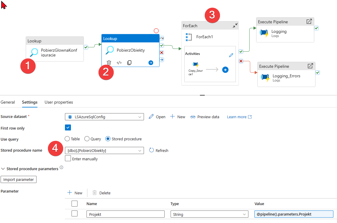 Jest to początkowy etap pobierania danego źródła. W tym wzorcu akcja ForEach wywoła pipeline, który będzie kopiował dane. Zanim jednak to zrobi potrzebuje trochę informacji.