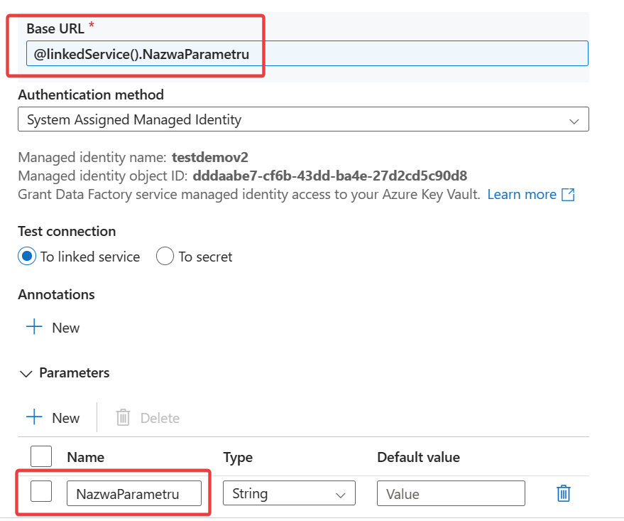 Tutaj dodam że wszystkie Linked Services powinny być sparametryzowane. tzn, że dynamicznie pobierasz ich konfiguracje z bazy, w której trzymasz wartości tych konfiguracji np. nazwa Key Vault, w którym trzymasz hasła. pochodzi z bazy a jej nazwa jest parametrem.